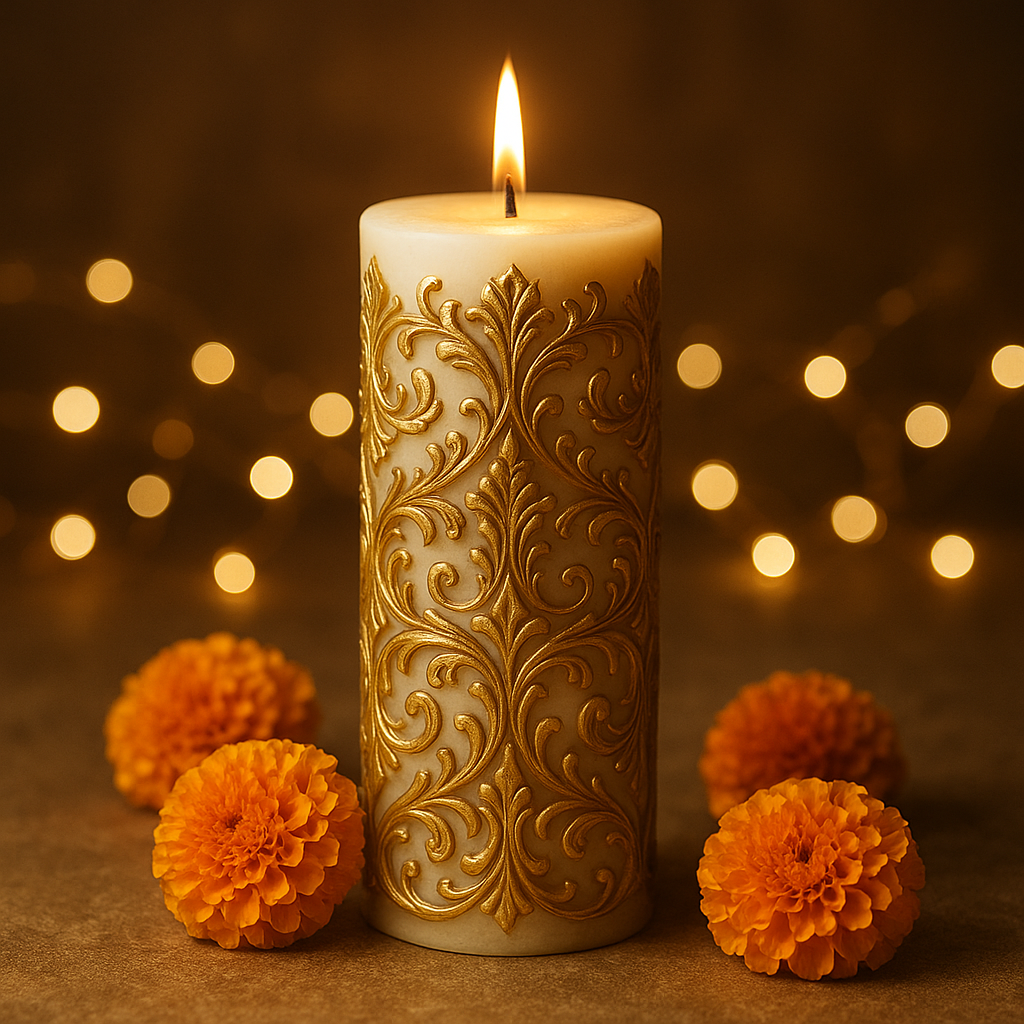 Crafted to celebrate joy, this tall golden-patterned pillar candle radiates elegance. Its glowing flame adds richness to your festive décor, creating a vibrant yet soothing ambience for every celebration.