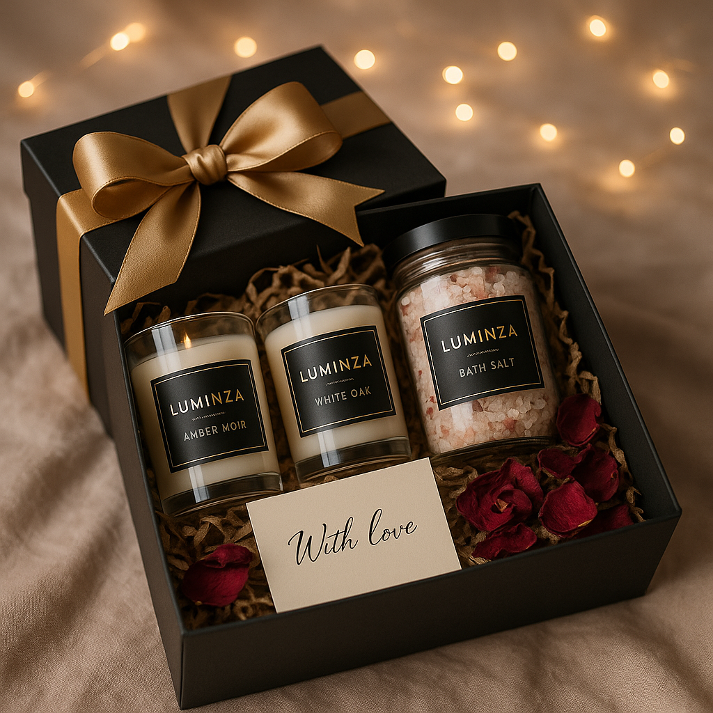 A perfect gift for love and togetherness. Includes two signature Luminza candles, handcrafted bath salts, and a heartfelt note, all elegantly wrapped in a black and gold box for an intimate luxury touch.